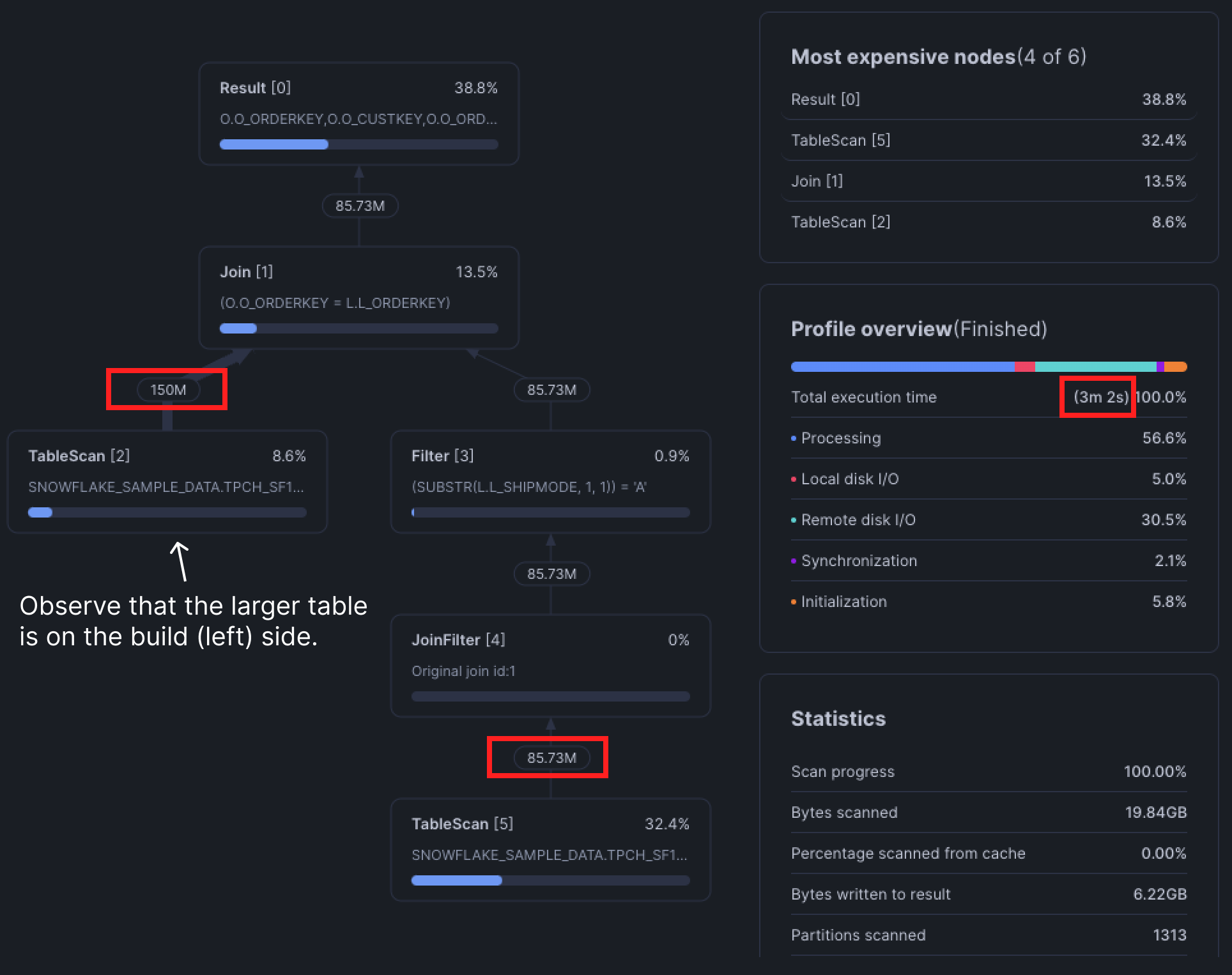 The key here is to reduce the amount of data read in our TableScan node in the query plan. Efficient queries minimize the amount of data scanned by: