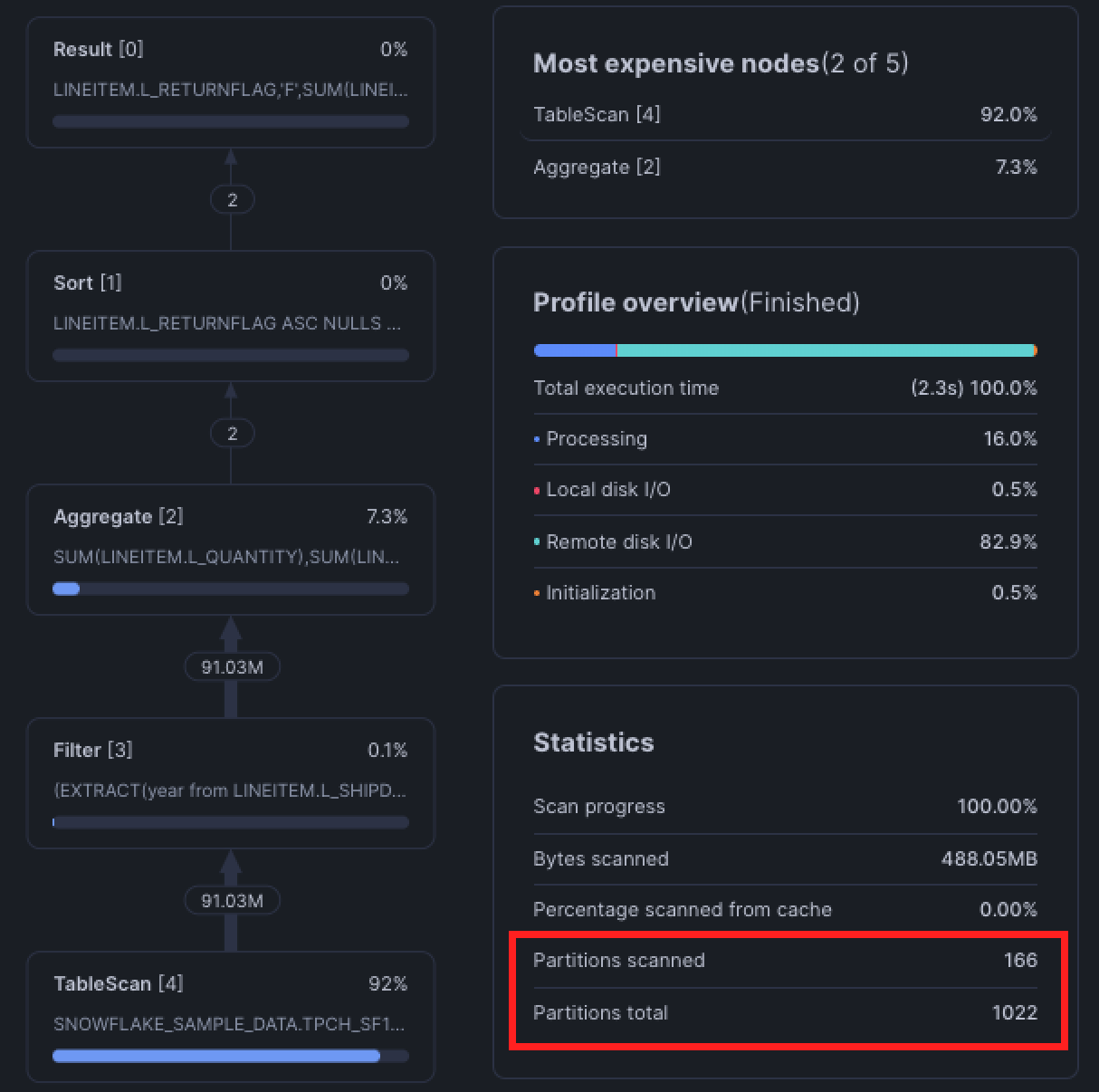To determine whether your query is pruning, review the query's Partitions Scanned against the Partitions Total in the bottom right Statistics tile. If a query is pruning properly, the Partitions Scanned will be less than the Partitions Total.